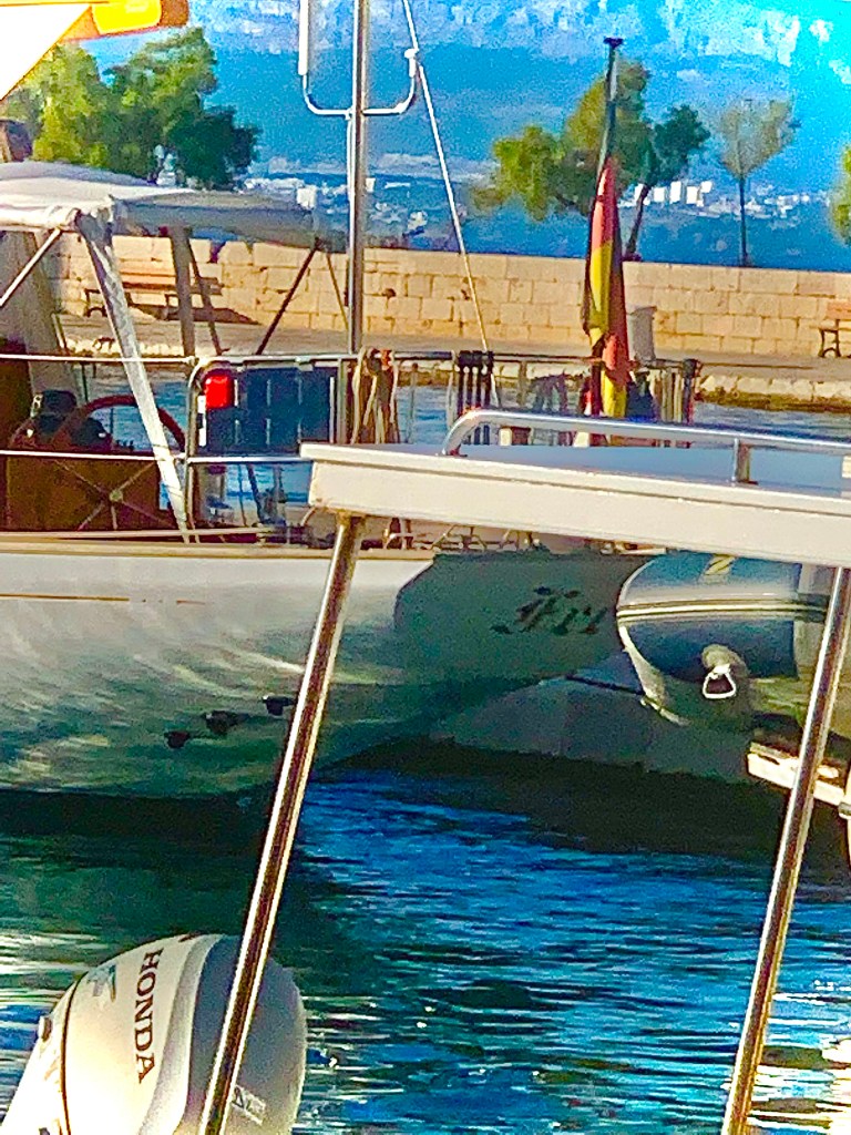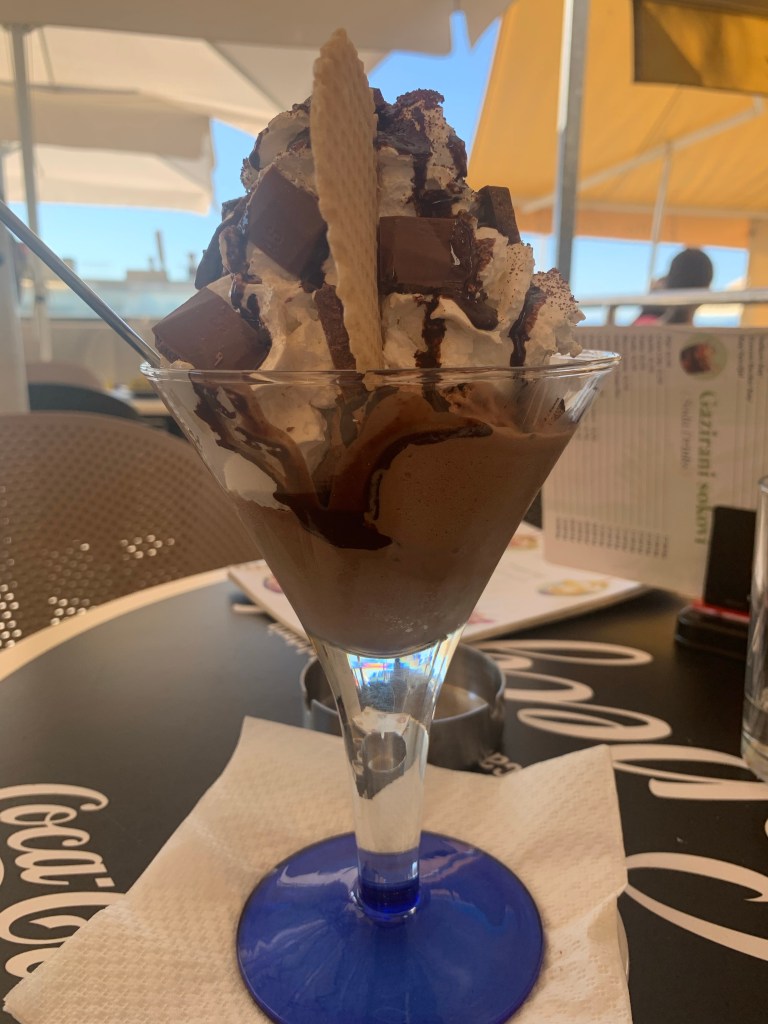 This was truly divine food and brain and body had agreed a truce on the timetable fiasco. Rich chocolate ice cream with a more generous helping of whipped cream, pieces of chocolate bar and smattering of chocolate sauce. Delicious. I decide to indulge myself yet in some people watching and watch the arrival and departure of small sail boats and yachts. Out of the corner of my eye I notice the is a yacht called “Fee” which brought a smile to my face was like Fiona waving reminding me she was here in spirit no doubt laughing at my mishap on the timetable.