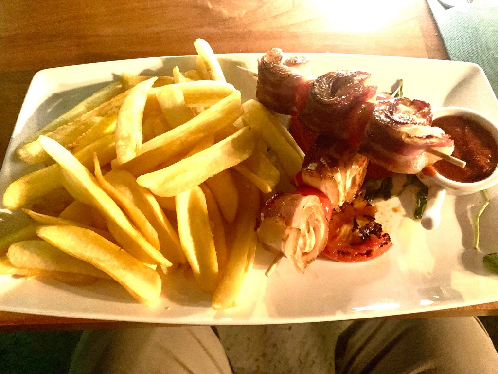 Arrive back in Split just before 1900 so back to the apartment for quick shower and spruce before out for dinner to find something interesting for eating. I decide to head for Republic Square which I noticed had some eateries when I stumbled upon it the other day. I ended up going to Big Macho which offered a few interesting menu items. I decided on Rolani Pileći Ražnjići. Which was chicken wrapped in Dalmatian ham (not the dog) with tomato sauce served with Ridgeback potatoes. Which I guess was what came back as I have noticed before Croatian cuisine doesn’t always come as one would expect but needless to say it was still tasty. What came was skewers (on later research that is the Ražnjići part) with chicken breast an almost bacon like meat with a side of Napoli sauce with potato wedges of sorts.