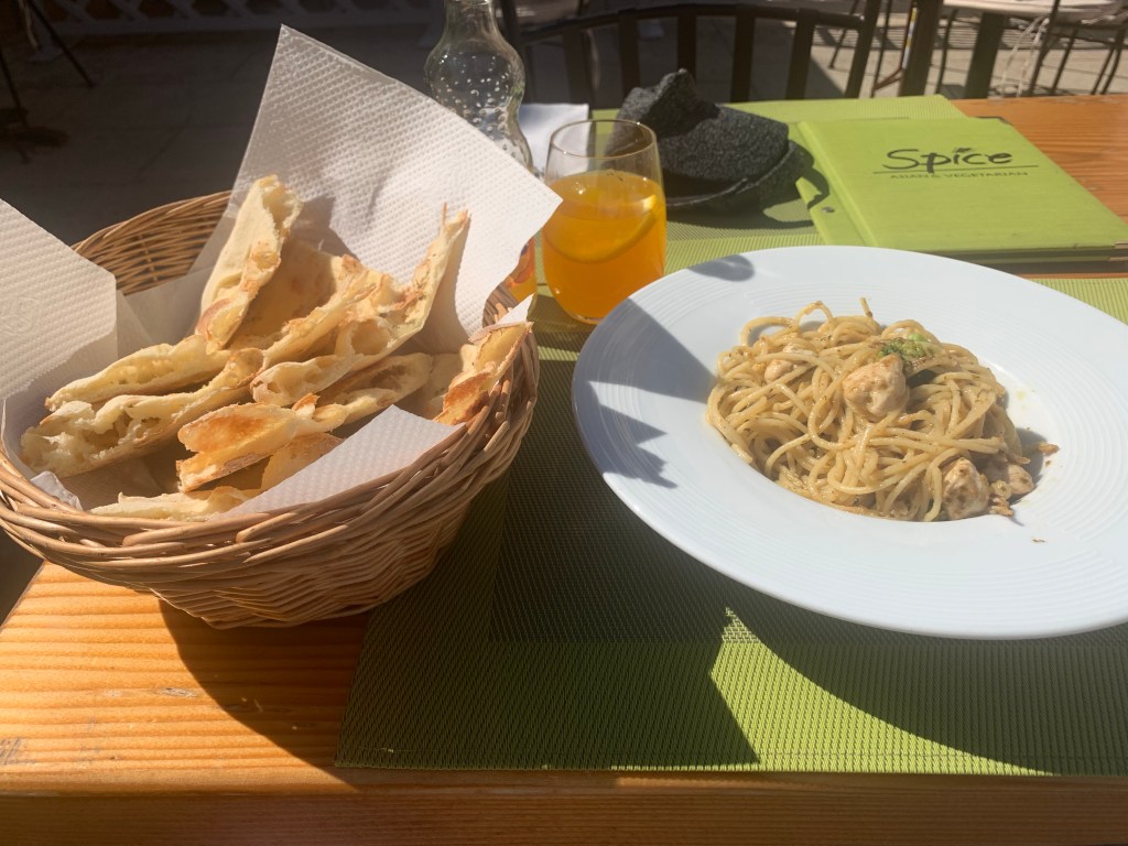 Well you didn’t see that coming a lunch of chicken and broccoli noodles with an overly generous portion of Balkan flatbread. It hits the spot. Light yet tasty and the tasted like there was a pesto like dressing over the noodles. RESULT! Fanta to drink as none of my favoured Lemon drink here. So if no substantially stodgy to repent what next for your intrepid adventurer.