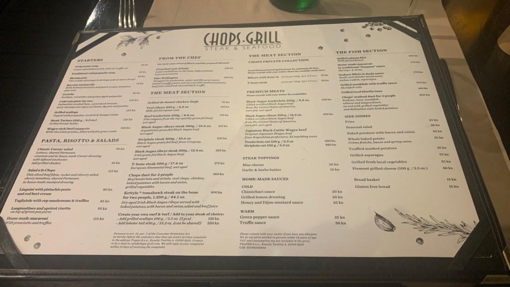 By now is quietly approaching time for the Catamaran back to Split and unlike my debacle earlier in the week this is last boat back today so I need to ensure I’m there for 1800. I’m there in good time and able to watch the boat come in. I’m on and boarded and as per before the boat departs bang on 1800. Arrival back in Split sees a massive increase in people from the last few days. Whether is additional weekend footfall or the cruise ship docked in the harbour I’m not sure but either way it’s electric down on the restaurants on the promenade and there are more people lingering awkwardly. So back to the apartment to get ready for my last supper.